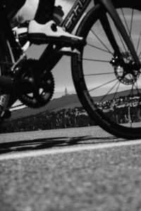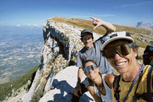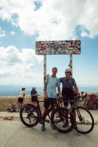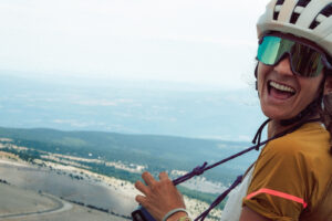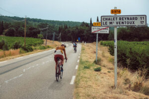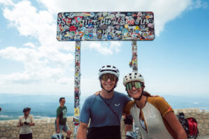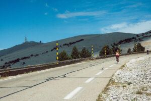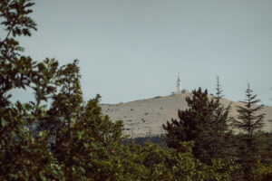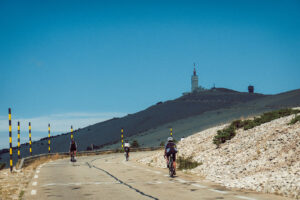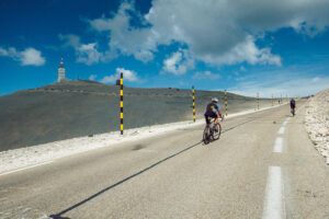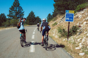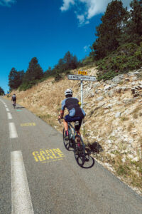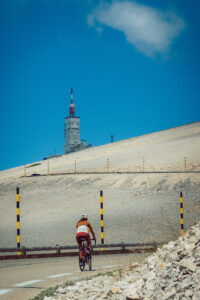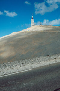La maggior parte di chi scala qui scala un paio di giorni di fila, e poi si prende una giornata di pausa, sia per la pelle delle dita che per l’avvicinamento. Noi, presi dall’entusiasmo dell’essere qui, dal non scalare da un po’, dal fatto che essere il falesia è plaisir rispetto all’andare in montagna, o alta montagna, decidiamo di arrivare fino al 7 giorno prima di dare una tregua alla pelle e collassare al lago! La verità è che un giorno di pausa il quarto giorno ce lo saremmo pure presi, ma abbiamo deciso di andare a fare il Mont Ventoux in bici. Il Mont Ventoux è una delle grandi salite del Tour de France. Noleggiamo le bici a Bedoin, da dove partiamo. Anche qui l’atmosfera è fighissima, un sacco di ciclisti, tanti negozi super sul pezzo che noleggiano bici da strada (noi ci siamo portati le nostre scarpe e le nostre pedaline), gruppetti o gente da sola che suda sulla pendenza costante del 10% e sui 21km che li separano dalla cima. Direi che io sono la prima a sudare qualche camicia: seconda uscita stagionale, senza considerare i rulli. Ma che soddisfazione! Il paesaggio una volta usciti dal bosco è lunare, non c’è più un solo cespuglio, solo pietre ed il “faro” del centro di raccolta dati del vento che ti guarda da lassù, invitandoti a raggiungerlo.