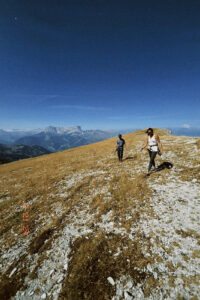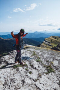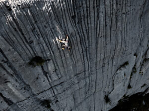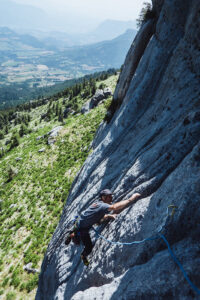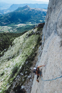 Arrivati in sosta prima del 6c+ la parete è una pannellata magnifica, e a prima vista completamente senza prese. Scalandolo poi ha il tipico sapore ceüsiano, buchetti, piedi che si vedono solo sporgendosi un po’. Continuo, costante, bello dal primo all’ultimo metro. L’ultimo tiro è un 7a, spittato decisamente allegro, che mette alla prova la concentrazione mentale. Una cannelure finale ci porta in cima all’altipiano. Per essere più leggeri abbiamo deciso di lasciare alla base tutto che ciò che non fosse strettamente necessario, tra cui anche le scarpe da approach. Così, scalzi, ci avviamo verso la ferrata a Un Pont sur l’Infinì.