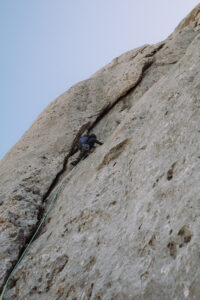 La via che abbiamo scelto per il giorno successivo l’abbiamo decisa più ispirati dal suo nome che non dai commenti trovati nella relazioni. Ci piaceva l’idea di essere scesi più verso sud: dunque “Meridionalizziamoci”. Una via gradata massimo 6a+, di stampo più moderno che classico, a detta del libro, e con soste attrezzate.