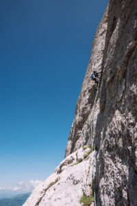 Il giorno successivo attacchiamo la seconda spalla scegliendo proprio una delle tante vie aperta dagli Aquilotti, Aquilotti ’75. Capiamo subito com’è il taglio del prato su queste placche e ci rendiamo conto di come, a parità “numerica”, i gradi siano più severi rispetto alle Dolomiti. Nonostante ciò ci divertiamo, scaliamo al sole su roccia magnifica e su micro appigli. Qui più che fare trave serve una gran tecnica di piedi 😉
