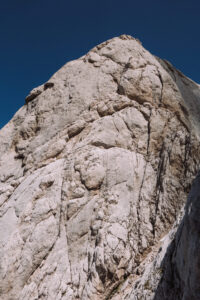 Partiamo in una bellissima giornata dal cielo terso. La parete nord della prima spalla, su cui corre Meridionalizziamoci, è ancora in ombra. Io batto i denti per tutto il primo tiro, fino a che la placca del secondo non mi da una bella sveglia. Piedi da spalmare su cose minuscole e via che andare. Mi giro verso Marco per complimentarmi con lui con lo sguardo. Da primi è tutto un altro sapore, soprattutto una volta scoperto che di moderno questa via ha ben poco (5 spit in 9 tiri) e placche non sempre proteggibili.