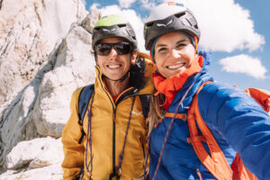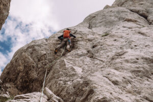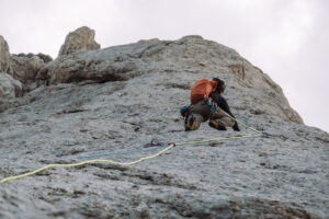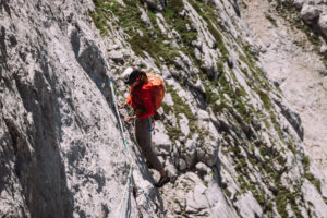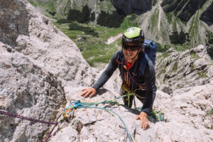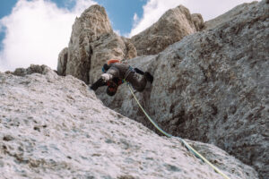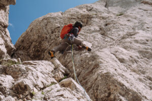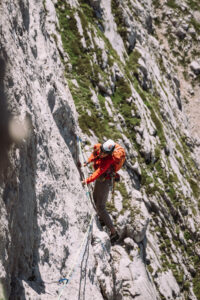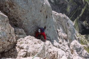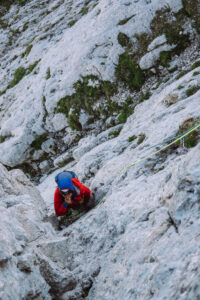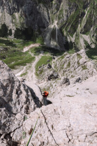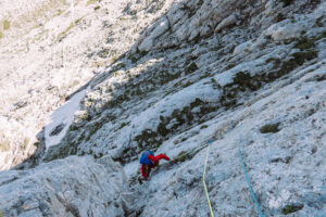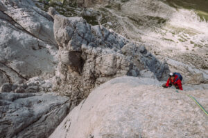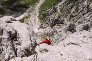 Dopo questo tiro, che ci ha fatto uscire, e per fortuna anche rientrare, più volte dalla nostra comfort zone, decidiamo finire percorrendo le ultime due lunghezze della via “Spigolo delle guide”, che si interseca con la nostra.