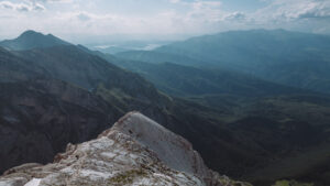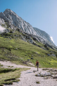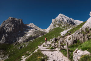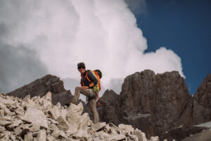 Continuiamo a salire percorrendo in conserva le roccette che ci portano sul ciglio della cresta della Prima Spalla, fino ad incontrare la via normale, che ci porterà sulla cima del Corno Piccolo.