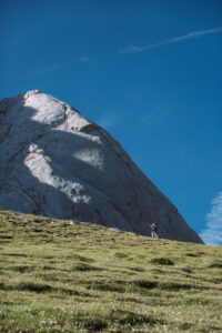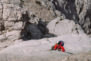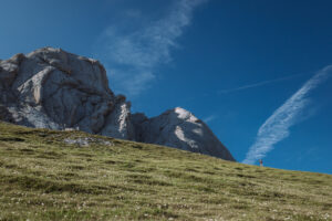 Usciamo per fare una corsa e rimaniamo incantati dalla compattezza della roccia. Un grigio intenso, uniforme, talvolta pure liscio, o almeno così sembra osservandolo dalla base degli impianti. Sulle due spalle del Corno Piccolo ci sono un sacco di vie, alcune storiche, aperte dal gruppo alpinistico abruzzese degli Aquilotti, che precede i famosi Scoiattoli di Cortina ed i Ragni di Lecco.
