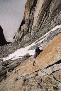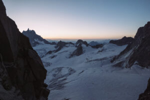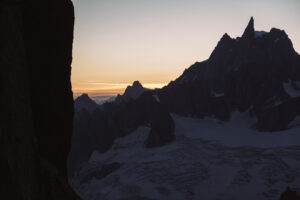 È buio pesto, si vedono le frontali degli alpinisti che ci hanno anticipato, alcuni diretti verso le Jorasses o la cresta di Rochefort, altri stanno camminano nel Cirque Maudit, forse verso l’Arete du Diable? Verso il Grand Capucin siamo la prima cordata. Arrivati all’attacco il cielo alle nostre spalle inizia timidamente a schiarirsi. La temperatura è perfetta ma la roccia è ancora fredda.