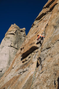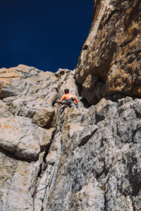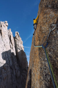 Seguiamo una linea evidente di fessure che in due/tre tiri ci porta a girare l’angolo, verso la parete sud. Da qui Marco mi urla “quando finisce la corda parti” e in neanche un’ora siamo alla terrazza degli Svizzeri. Il sole sta per illuminare il primo tiro. Tempismo perfetto, ed io non vedo l’ora di togliermi il guscio e sentire un po’ di calore sulle mani. Dietro di noi c’è una cordata di ragazzi spagnoli, Gaiska e Sergie. Sono amici di Philipp Klein, un fotografo spagnolo che finalmente abbiamo avuto la fortuna di incontrare e conoscere di persona con un piacevole incontro casuale al Torino. Condivideremo con loro tutta la via di salita, nonché tutta l’elettrizzante discesa!