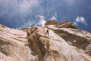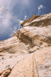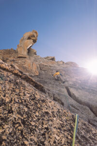 I primi tiri sono a dir poco magnifici. Roccia incredibile, ambiente spettacolare. Grado divertente e plaisir. Il sole del mattino con la sua luce calda rende ancora più rossi i cristalli che compongono questo granito. Io perdo subito il conto dei tiri. Quando ti stai divertendo pensi solo a scalare, il tempo vola e anzi, forse è un peccato rendersi conto che siamo “già” a metà via. Nonostante ce la fossimo presa con calma, sia per goderci la salita, sia per filmare, siamo già all’incrocio tra la via degli Svizzeri e O sole mio. Purtroppo i tiri sopra sono ancora all’ombra, e così rimarranno. D’altronde non si può avere tutto: via libera e tiri al sole. È sempre un gioco di compromessi 😉