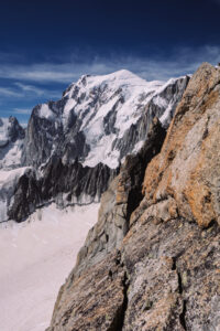 Il Grand Capucin è il più alto tra i satelliti, raggiunge i 3838m d’altitudine e la via, o meglio l’unione delle due vie che abbiamo deciso di percorrere che sono “la via degli Svizzeri” con uscita su “O sole mio”, hanno 300 metri di viaggio verticale a partire dall’attacco ufficiale alla “terrazza degli svizzeri”, più circa 150 metri di zoccolo dalla base. Ci sarebbero due possibilità per arrivare all’attacco della via, percorrere il ripido (ed ora secco e sassoso) canale alla sinistra del Grand Cap oppure iniziare a scalare dalla sua base, dove partono le vie dell’imponente parete est. Noi abbiamo optato per questa seconda opzione, onde evitare di trovarci in un potenziale colatoio di pietre.