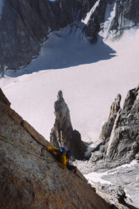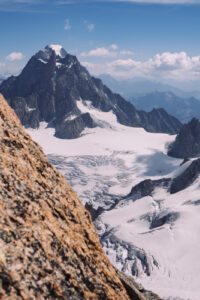 Temperatura a parte, i tre tiri di 6a/6a+ sono stupendi, placche intervallate da qualche fessura, un po’ d’aria sotto ai piedi che inizia a farsi sentire ed un panorama alle nostre spalle che aspetta solo di essere guardato. Mi chiedo come mai abbiamo aspettato fino ad oggi per venire qui. L’ambiente però si fa sentire anche quando non è osservato. Dalla Tour Ronde cadono pietre che vanno dalla dimensione di un microonde fino ad una lavatrice. Fa paura come la montagna stia piangendo e si stia autodistruggendo. Il fragore di un crollo ci obbliga a fermarci da tanto è forte, sembra attaccato a noi.