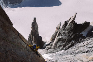 Mentre recupero la corda mi guardo in giro. Dente del Gigante, Monte Bianco, le punte della Diable, Kufner e tante altre salite e guglie a perdita d’occhio. Emozionante essere quassù, in punta al Grand Capucin. La salita è stata talmente bella che il tempo mi è volato.