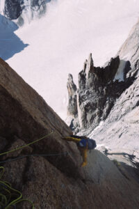 10 tiro: dritti sopra la sosta e poi proseguire traversando in piano rimanendo a sinistra lato “Aiguille du Midi” ben appigliato per poi sostare qualche metro più in la dove si trova una sosta full inox dove iniziano le calate.