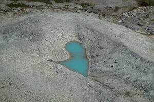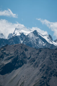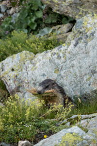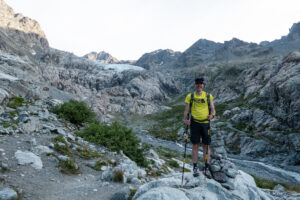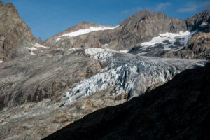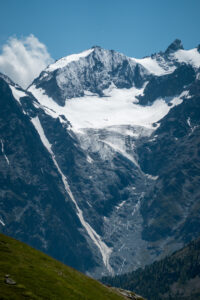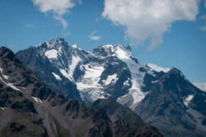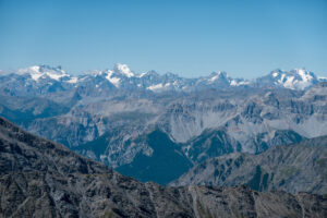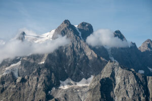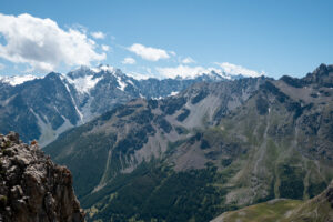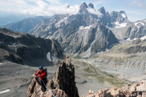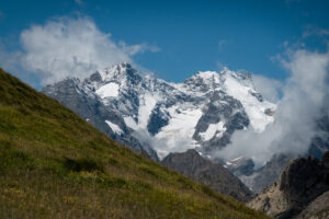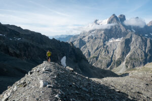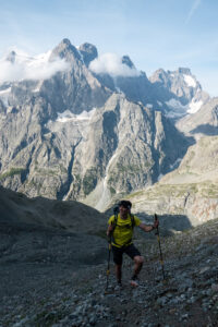 Ci prendiamo il tempo per una pausa, godendoci l’ambiente spettacolare che ci circonda: sullo sfondo la catena degli Écrins, con Pelvoux, Barre e la Meije, mentre dall’altro lato svetta il Monte Bianco.