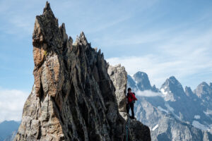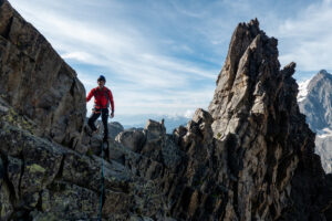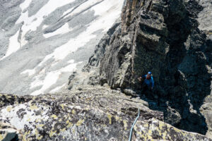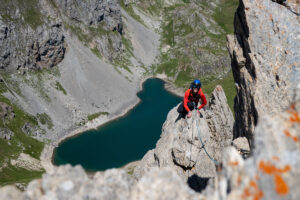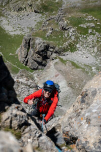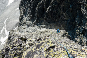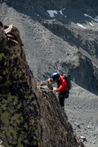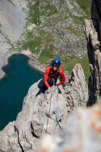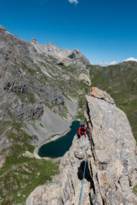 Dopo i primi due tiri siamo sul filo di cresta, dove resteremo fino in cima. La progressione è varia e divertente: tratti di conserva lunga si alternano a tiretti e a qualche calata. C’è un po’ di tutto: esposizione, passi atletici, sezioni più appoggiate dove la gestione della corda e del proprio compagno sono indispensabili per una progressione veloce e sicura.