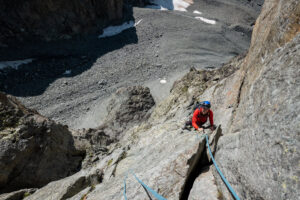 Dopo circa un’ora e mezza di avvicinamento, raggiungiamo l’attacco della cresta, poco dietro una cordata francese — l’unica che incontreremo in tutta la giornata. La partenza è un po’ delicata: la roccia, lisciata dai numerosi passaggi, richiede attenzione. Non mi faccio problemi a tirare due rinvii i, e nemmeno Marco, che sale veloce.