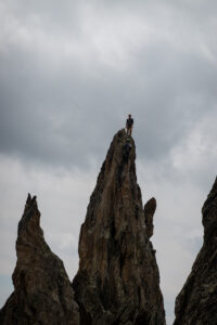 Poi arrivano i due tiri più impegnativi: circa 25 metri sul lato est, su difficoltà intorno al IV grado. L’esposizione si fa sentire, e qualche passaggio più tecnico mette un pò in difficoltà Marco, che, arrivato in sosta, mi guarda e con il suo inconfondibile accento toscano se ne esce con un “Ma che sei ciucco?” 😂